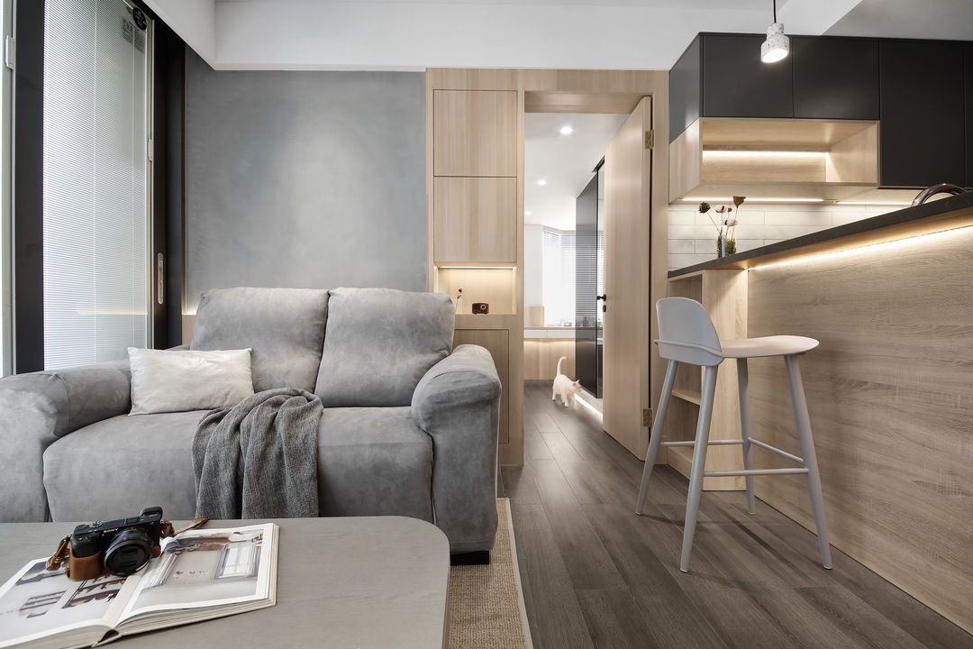 把廚房設計為開放式,吧臺和餐桌結合(很少做飯,平時都是點外賣)。