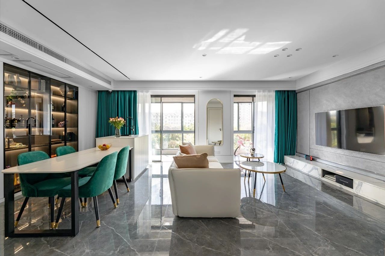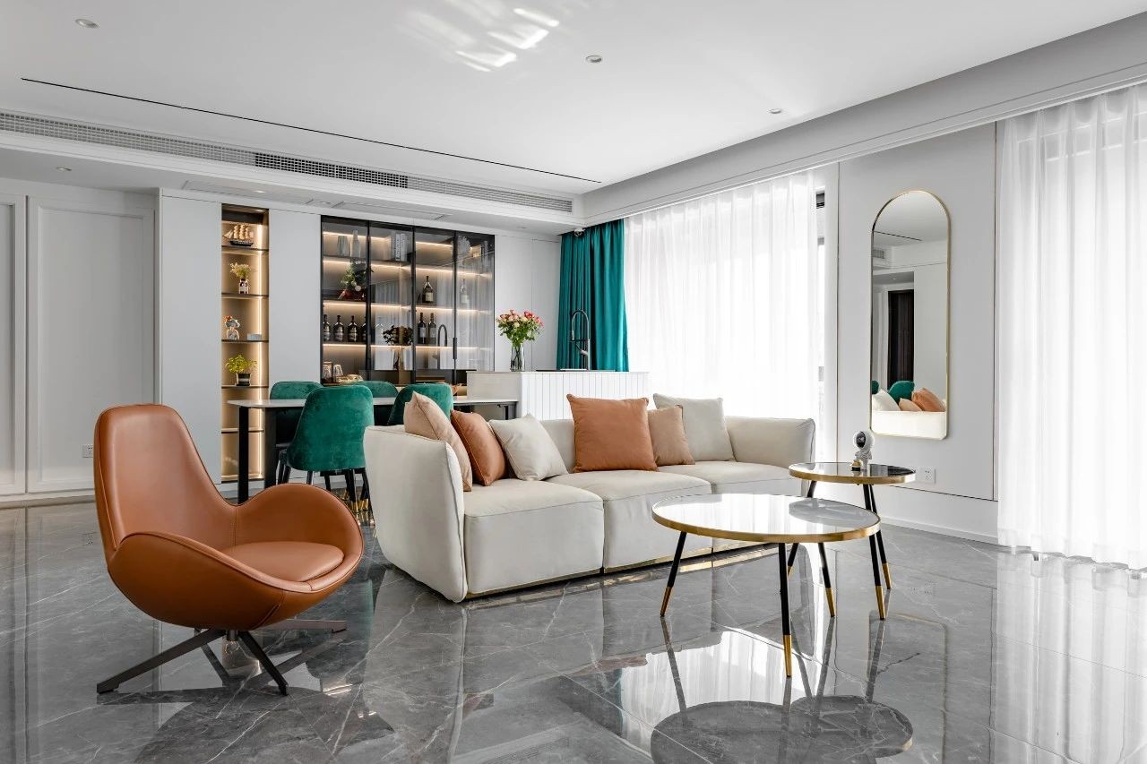 整體以灰白為主,用墨綠、橙色、金屬元素作為點綴,勾勒出空間層次的線條感,營造一種活潑輕松的氛圍