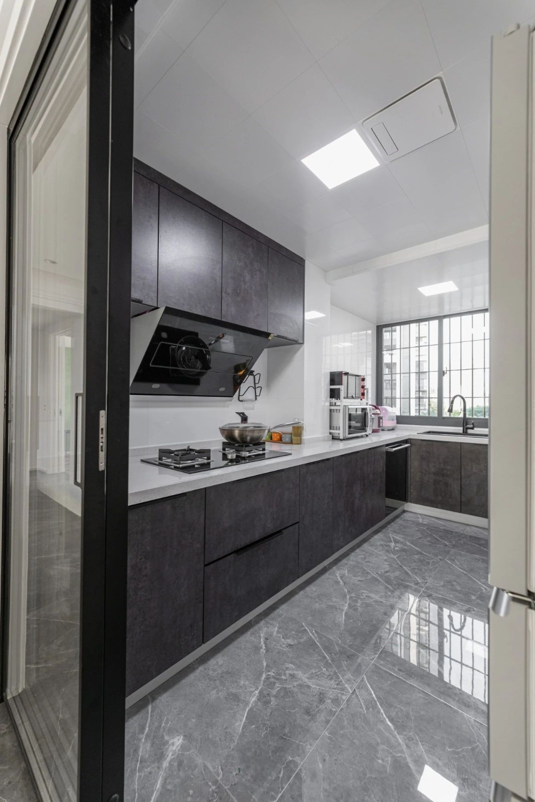 廚房的深色設計,仿佛沉淀了所有煙火氣,玻璃移門讓空間更加通透明亮,也能看到孩子在客廳的活動狀態。